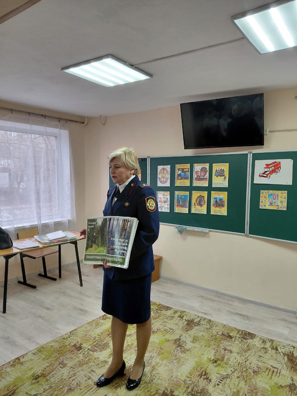 Инна Геннадьевна рассказала школьникам о том, что огонь- судья беспечности людей. Давным-давно люди научились добывать огонь. Шли годы, тысячи лет и люди постепенно научились использовать силу огня, чтобы согреться, готовить пищу, заставлять работать машины. Огонь – друг человека. И сегодня без огня не обойтись: он согревает и кормит нас. Но кроме большой пользы, люди одновременно узнали и разрушительную силу огня. Когда забывают об осторожном обращении с огнем, он становится смертельно опасным. Огонь выходит из повиновения, не щадит никого и ничего. Возникает пожар. Пожар не случайность, а результат неправильного поведения. В пламени погибают люди, сгорают жилища, посевы, скот, леса, целые деревни и даже города. Большая часть пожаров происходит по вине самих людей, от их небрежности в обращении с огнем. Пожар может возникнуть всюду, где огонь найдет хотя бы малейшую лазейку. Это и не выключенный вовремя утюг или чайник, непогашенный костер, неисправная электропроводка и шалость детей и подростков.